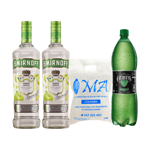 Select&Go | 2 Vodka Smirnoff Green Apple 700ml + Hielo MA Coldgem 3.0Kg + Evervess 1.5L